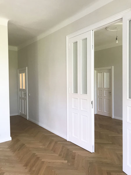 Eine große Altbauwohnung in Berlin Wilmersdorf wurde 2019 umfassend umgebaut. Es wurden alle Fußböden und Türen ersetzt, das Bad vergrößert und saniert sowie eine neue Küche eingebaut. Der eigentliche Altbaucharme der Wohnung war aufgrund von Umbauten in den 1950er Jahren verloren gegangen und wurde nun durch den Umfang der Sanierung wiederhergestellt. Hierfür wurden neues Fischgrätparkett in Eiche auf einem neuen Unterbau verlegt und große Vollholztüren in Optik der verloren gegangenen Türen neu gebaut. |